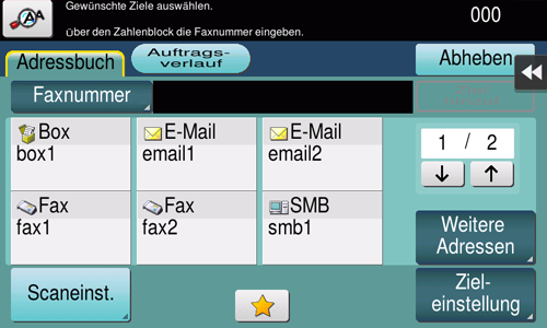 [Fax] | Zeigt den Hauptbildschirm im Faxmodus an. Der Faxmodus stellt nur die Faxfunktionen der Funktionen bereit, die im Scan-/Faxmodus verfügbar sind. In diesem Modus können Sie schnell die Zielfunktion abrufen, wenn Sie ein Fax verwenden. Im Faxmodus gelten die folgenden Bedingungen.