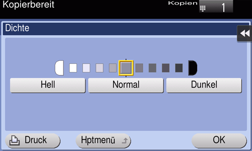 Sie können beim Kopieren von Originalen mit Farbhintergrund (Zeitung, Recycling-Papier etc.) sowie bei Originalen, die so dünn sind, dass Text oder Bilder auf der Rückseite gescannt würden, die Dichte des Hintergrunds einstellen.