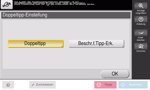 [Doppeltipp] | Interpretiert ein dauerhaftes Tippen auf dieselbe Taste als Doppeltipp-Vorgang. Sie können das Intervall für die Doppeltipp-Erkennung in fünf Stufen ändern (Standard: [Standard]). Doppeltippen Sie auf das Feld rechts im Bildschirm, um die aktuelle Einstellung zu prüfen. |