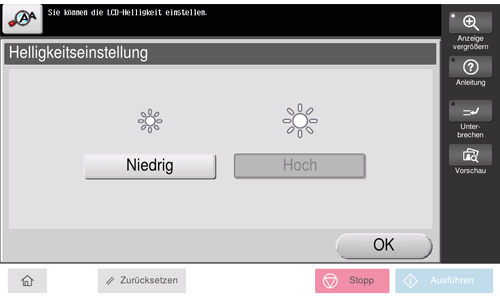 Stellen Sie die Helligkeitsstufe des Touch Displays ein.