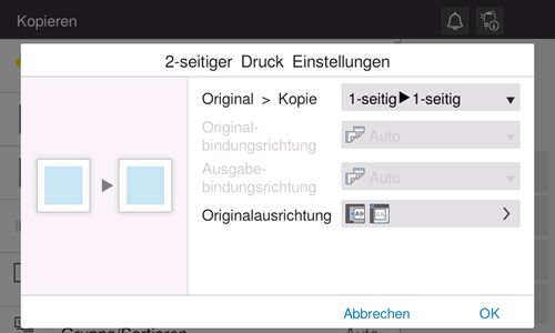 Wählen Sie unter [Original > Kopie] die Option [1-seitig > 2-seitig] aus, und wählen Sie dann die gewünschte Bindeposition für den Kopiervorgang unter [Ausgabebindungsrichtung] aus.