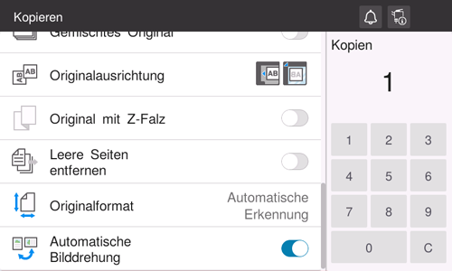 Wählen Sie unter [Automatische Bilddrehung] die Option entsprechend der aktuellen Ausrichtung von Papier und Original aus und tippen Sie dann auf [OK].