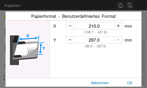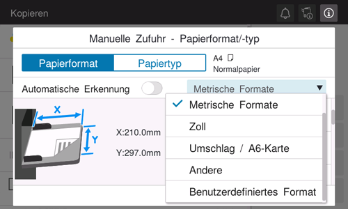 Geben Sie im Papierbildschirm des Kopiermodus das Fach an, in dem Papier in einem benutzerdefinierten Format eingelegt ist; dadurch haben Sie die Möglichkeit, auf Papier in einem benutzerdefinierten Format zu drucken.