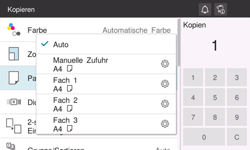 [Papier] | Wählen Sie das Papierfach aus, in dem das Papier zum Kopieren eingelegt ist. |
