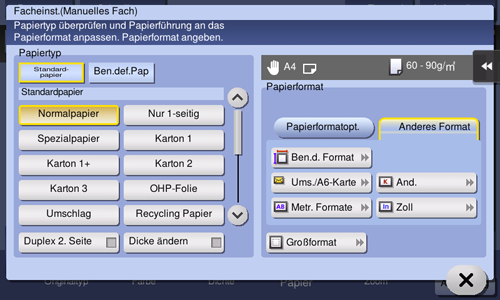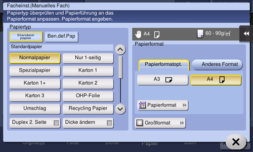 Der Bildschirm für die Auswahl des Papierformats und des Papiertyps wird angezeigt.