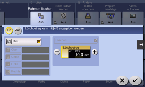 Tippen Sie auf [Ein] und geben Sie die Breite des zu löschenden Falzbereichs ein und tippen Sie dann auf [OK].