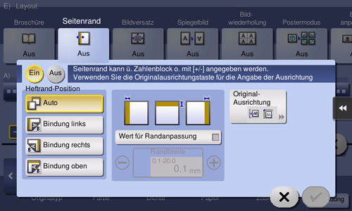 [Bindung links]/[Rechtsbindung] | Wählen Sie die Bindeposition für die Ausgaben aus. |