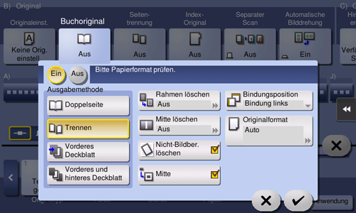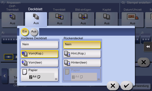[Deckblatt] | Verwenden Sie diese Option, um die vorderen und hinteren Deckblätter auf anderes Papier zu drucken, wenn ein Original mit einem vorderen und einem hinteren Deckblatt kopiert wird. Beim Kopieren eines Originals ohne vorderes oder hinteres Deckblatt können Sie diese Funktion verwenden, um leere Blätter als vorderes und hinteres Deckblatt einzufügen. |