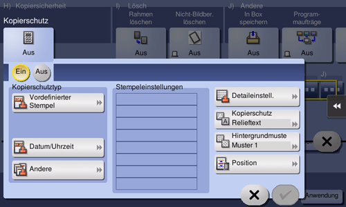 Tippen Sie auf [EIN] und konfigurieren Sie die entsprechenden Optionen für die Kopierschutzfunktion.