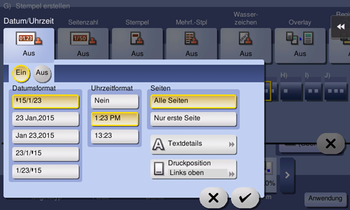 Wenn mit den Grundeinstellungen Stempeltext, Datum und Uhrzeit oder Seitenzahlen nicht gut leserlich sind, tippen Sie in jedem der Einstellungsbildschirme [Datum/Uhrzeit], [Seitenzahl] und [Stempel] auf [Textdetails] und definieren Sie die Textgröße und die Schriftart.