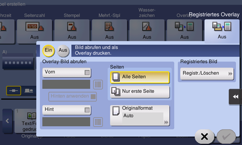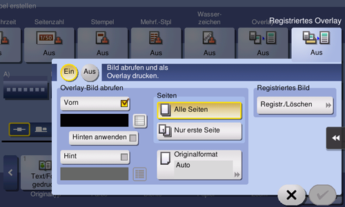 Legen Sie das Original mit dem zu registrierenden Overlay-Bild ein, ändern Sie ggf. die Bildeinstellungen und tippen Sie dann auf [Start].
