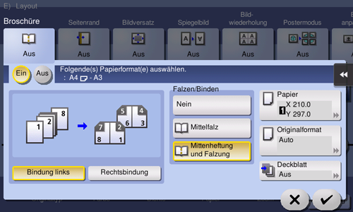 Für die Verwendung der Funktion "Mittelheften und Falzen" wird eine Zubehörkomponente benötigt. Ausführliche Informationen zu den erforderlichen Zubehörkomponenten finden Sie Hier.