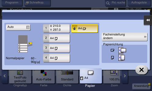 Wenn das Papier auf [Auto] eingestellt ist, wird eine Meldung angezeigt, dass das Papierfach gewechselt wird. Tippen Sie auf [Ja].