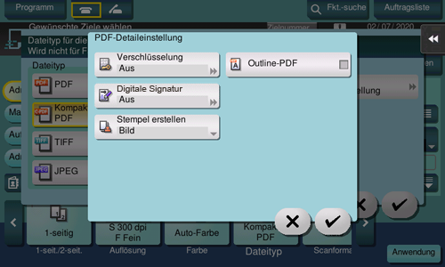 [PDF/A] | Wählen Sie [EIN], um eine PDF-Datei auf der Basis von PDF/A zu erstellen.