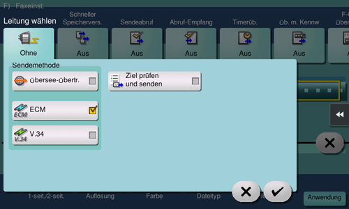 [Sendemethode] | Ändern Sie den Kommunikationsmodus basierend auf den Leitungsbedingungen. [ECM]: Der ECM-Modus ist ein Fehlerkorrekturmodus, der von der ITU-T (International Telecommunication Union (Internationale Fernmeldeunion) - Telecommunication Standardization Sector (Telekommunikationsstandardisierungssektor)) definiert wurde. Faxsysteme, die mit der ECM-Funktion ausgestattet sind, können damit miteinander kommunizieren und bestätigen, dass die gesendeten Daten fehlerfrei sind. Dadurch werden Unschärfen im Bild aufgrund von Rauschen in der Telefonleitung verhindert. Die Übermittlungszeit kann verkürzt werden, indem ECM für die Übertragung ausgeschaltet wird. Es können jedoch in Abhängigkeit vom angegebenen Wert für die Übermittlungszeit Bild- oder Übertragungsfehler auftreten. Passen Sie daher den Wert immer an die jeweiligen Bedingungen an.