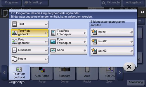 [Bildanpassungsprogramm aufrufen] | Rufen Sie das Bildqualitätsanpassungsprogramm auf. Der registrierte Inhalt eines Programms wird angewendet. Für das Bildanpassungsprogramm können die Einstellungen [Originaltyp], [Dichte], [Hintergrundentfernung], [Textverbesserung], [Negativ-/Pos.umkehr], [Hintergrundfarbe], [Farbjustage] und [Spiegelbild] registriert werden. Ausführliche Informationen zum Registrierungsvorgang finden Sie Hier. |