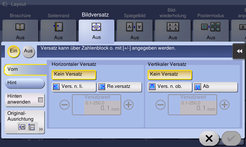 [Vorderseite]/[Rückseite] | Passt die Bildposition auf dem Druckpapier an, indem das Bild in horizontale oder vertikale Richtung verschoben wird.