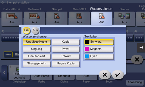 Text wie "Kopie" oder "Privat" wird auf allen Seiten in der Mitte in einer getönten Farbe gedruckt.