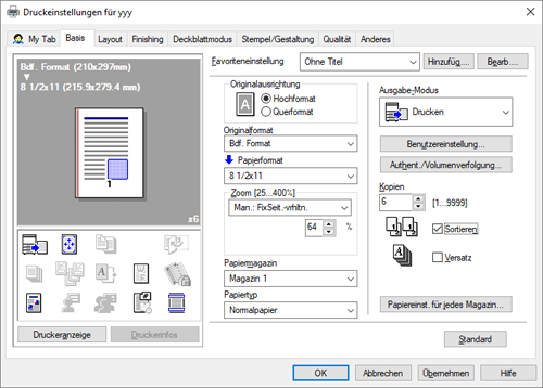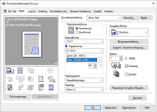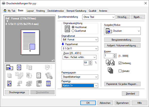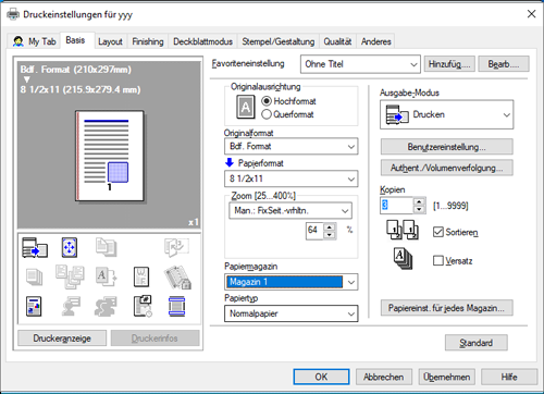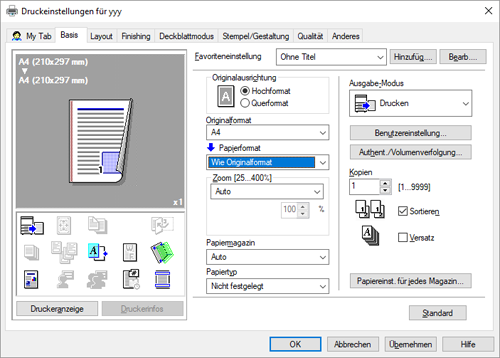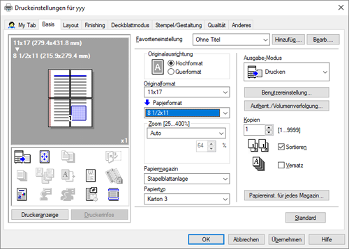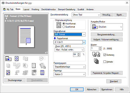Wählen Sie unter [Papierformat] auf der Registerkarte [Basis] das Format des Papiers für den Druck aus. Der Zoomfaktor wird automatisch anhand des unter [Originalformat] und [Papierformat] ausgewählten Formats bestimmt.