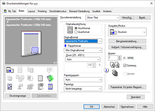 Wählen Sie auf der Registerkarte [Basis] unter [Originalformat] entweder [Umschlag] oder [Postkarte] aus.