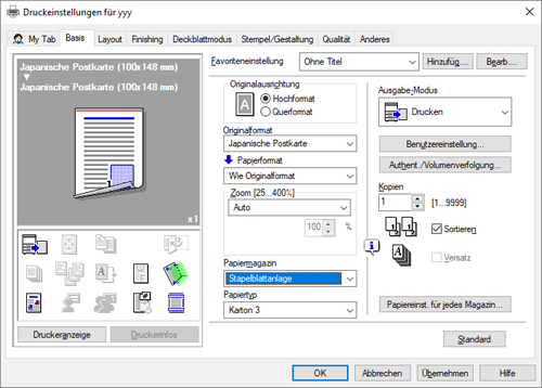 Wenn [Postkarte] ausgewählt ist, wird [Papiertyp] automatisch auf [Karton 3] eingestellt. Wenn [Umschlag] ausgewählt ist, wird [Papiertyp] automatisch auf [Umschlag] eingestellt.