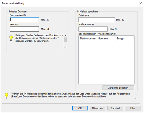 Die Daten, die mit der Funktion für sicheres Drucken ausgegeben wurden, werden in der Benutzerbox für sicheres Drucken gespeichert. Zum Drucken der gespeicherten Daten müssen Sie die im Druckertreiber gespeicherte Dokumenten-ID und das dazugehörige Kennwort eingeben.