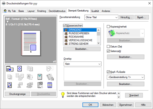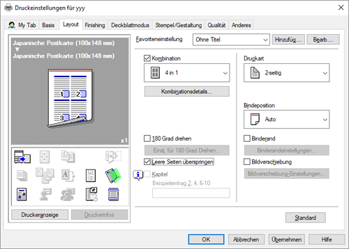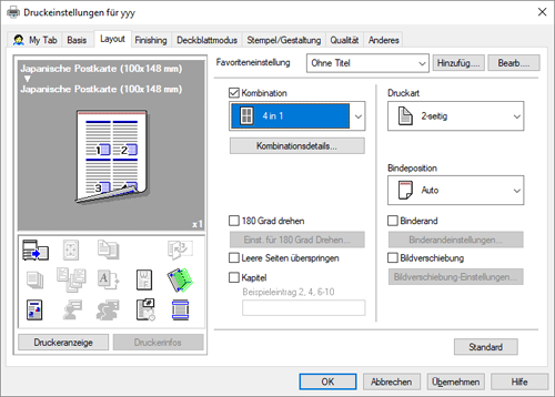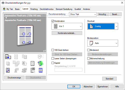 Wenn Sie diese Funktion in Kombination mit der Funktion für den 2-seitigen Druck ([Druckart]: [2-seitig]) verwenden, können Sie noch mehr Papier sparen.