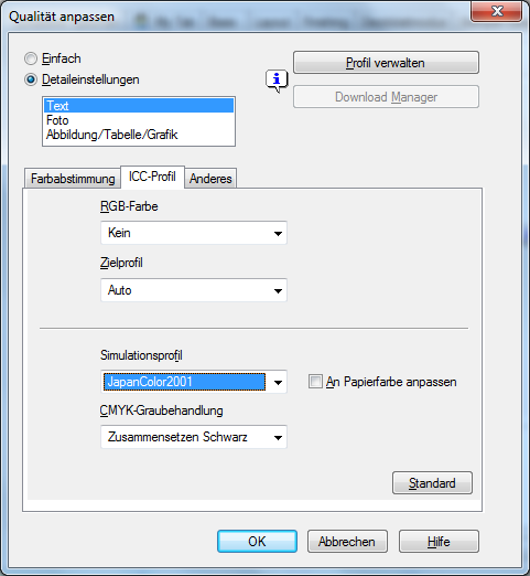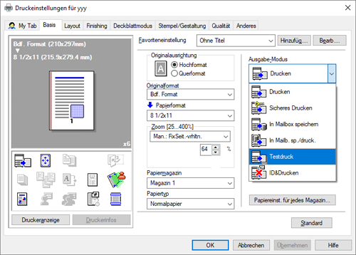 Wählen Sie unter [Ausgabe-Modus] auf der Registerkarte [Basis] die Option [Testdruck].