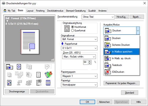 Wählen Sie unter [Ausgabe-Modus] auf der Registerkarte [Basis] die Option [In Box speichern].