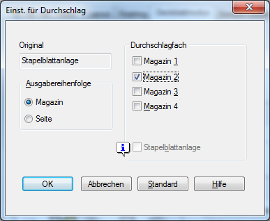 [Durchschlagfach] | Wählen Sie das Papiermagazin für die Durchschlagkopien aus. Aktivieren Sie die Kontrollkästchen aller zu verwendenden Papiermagazine. |