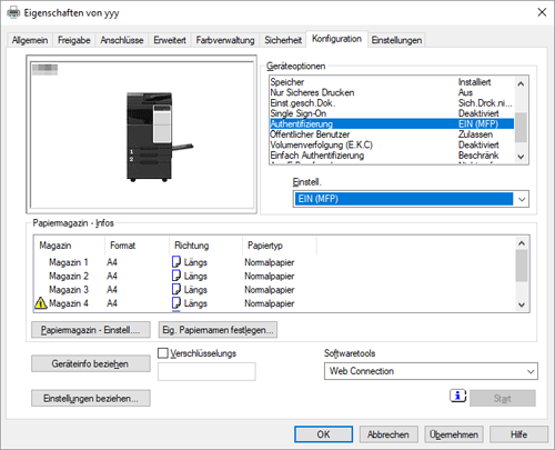 Überprüfen Sie unter [Geräteoptionen] auf der Registerkarte [Konfiguration], ob die Einstellungen für die Benutzerauthentifizierung/Kostenstellenfunktion ordnungsgemäß für Ihr Betriebssystem eingerichtet sind.