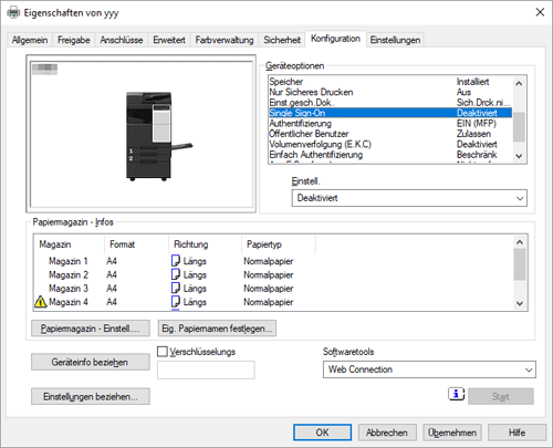 Überprüfen Sie unter [Geräteoptionen] auf der Registerkarte [Konfiguration], ob die Einstellungen für [Authentifizierung] und [Single Sign-On] ordnungsgemäß für Ihr Betriebssystem eingerichtet sind.