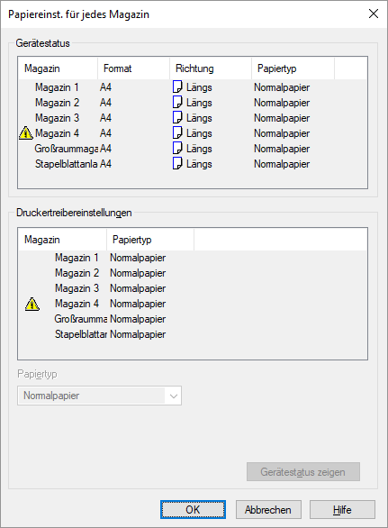 Wenn [Papiereinst. für jedes Magazin] im Register [Einstell.] des Druckertreibers aktiviert ist, wählen Sie [Papiereinst. für jedes Magazin...] im Register [Grundeinst.] und geben den Papiertyp für jedes Fach an.