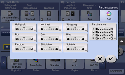 Passen Sie die Farbqualität des Originals für das Kopieren an. Sie können die Ausgabe überprüfen, indem Sie eine Testkopie drucken.