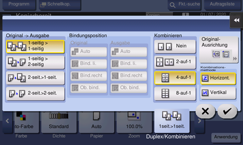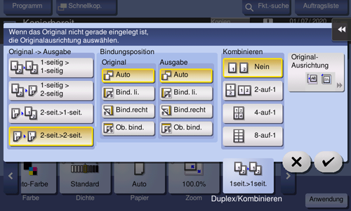 [Original > Ausgabe] | Wählen Sie eine Kombination des einzulegenden Originals (1-seitiges Original oder 2-seitiges Original) und die Kopiermethode (1-seitige Kopie oder 2-seitige Kopie). Wenn Sie eine andere Option als [1-seitig > 1-seitig] ausgewählt haben, geben Sie auch [Bindeposition] und [Originalausrichtung] an. | |
