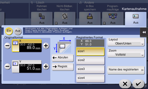 [Originalformat] | Geben Sie die Größe der zu kopierenden Karte an. Unter [Registriertes Format] können Sie ein zuvor gespeichertes Format abrufen und das Format angeben. Wählen Sie nach der Eingabe des Formats eine Taste unter [Registriertes Format] aus und tippen Sie auf [Registrieren]. Das eingegebene Format wird damit im Speicher registriert. Sie können das registrierte Format zu einem späteren Zeitpunkt wieder abrufen. |