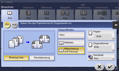 Wenn die Mittenheftung aktiviert ist, wird die Option [Broschüre] automatisch auf [Ein] gesetzt.