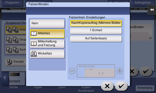 Ein kopiertes Blatt wird vor der Ausgabe in der Mitte gefalzt. Wählen Sie auch die Einheit für das Falzen des Papiers aus: [Nach Kopierauftrag (Mehrere Blätter)], [1 Einheit] oder [Auf Seitenbasis]. Wenn Sie [Auf Seitenbasis] auswählen, geben Sie die Anzahl der Seiten an, die gleichzeitig gefalzt werden sollen.