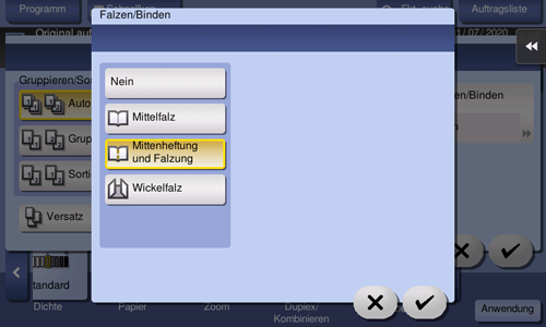 [Falzen/Binden] | Die Kopien werden vor der Ausgabe in der Mitte geheftet oder gefalzt.