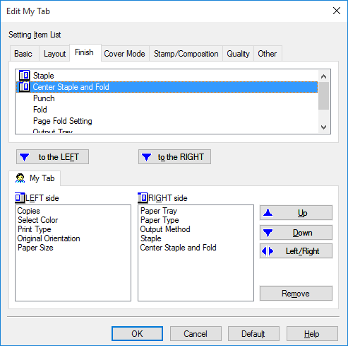From [Setting Item List], select the function you want to register in [My Tab], then click [to the LEFT] or [to the RIGHT].