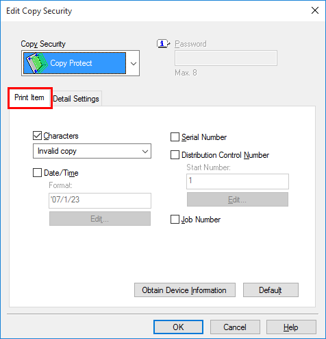 Items that can be specified vary depending on the selected copy security function.