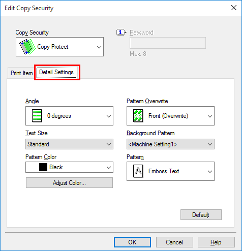 [Pattern Color] | Select the color of the copy security pattern. As necessary, click [Adjust Color...] to adjust the density and contrast. |