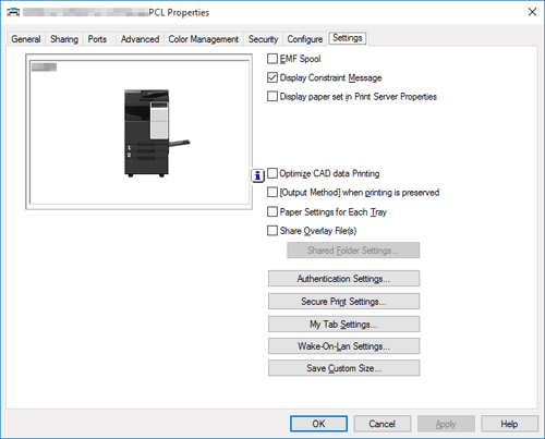 [Optimize CAD data Printing] | Select this check box to print CAD data. In some cases, the print data size is reduced, increasing the printing speed. Do not select this check box when not printing CAD data. |