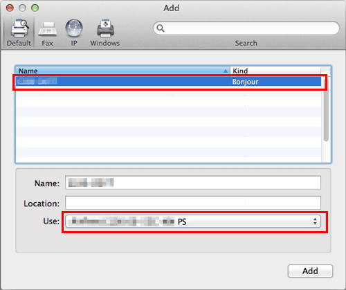 • Select [Select Software...] from [Use:], then click the driver of the desired printer from the list that is displayed in another window.