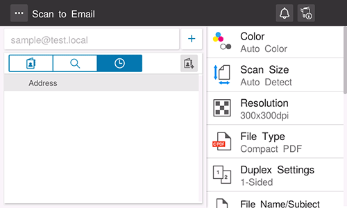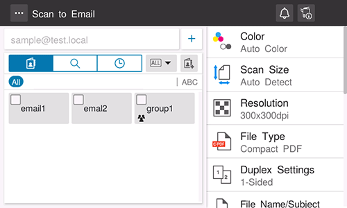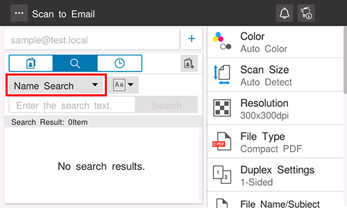 Tapping the Search tab () displays the destination search screen. If the LDAP server or the Active Directory of Windows Server is used for user management, you can search for (LDAP Search) destination information registered in the server and specify the desired destination.