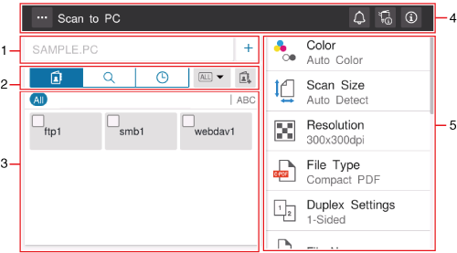 If you tap [Scan to PC] on the home screen, the main screen for PC sending (SMB/FTP/WebDAV) is displayed.