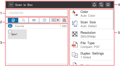 If you tap [Scan to Box] on the home screen, the basic screen of Save in User Box is displayed.