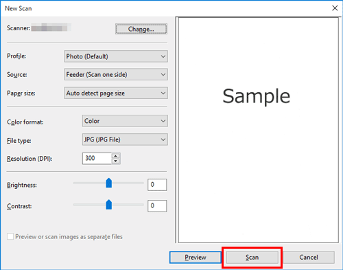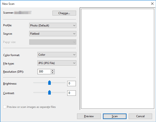 If you select [Flatbed] in [Source], click [Preview] before saving data as a file, and check the image of the scanned original.