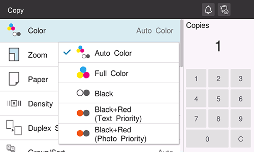 [Auto Color] | Makes copies with color settings to suit the colors of the scanned original. |