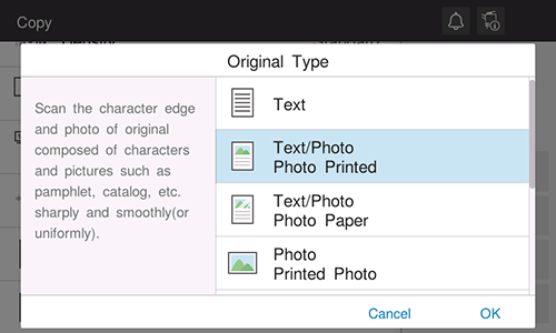 [Text/Photo - Printed Photo] | Copies the original, which consists of text and photos, at the optimum level of image quality. This function sharpens the edges of each character and reproduces smoother photos. Select this option to scan printed originals such as brochures and catalogs. |